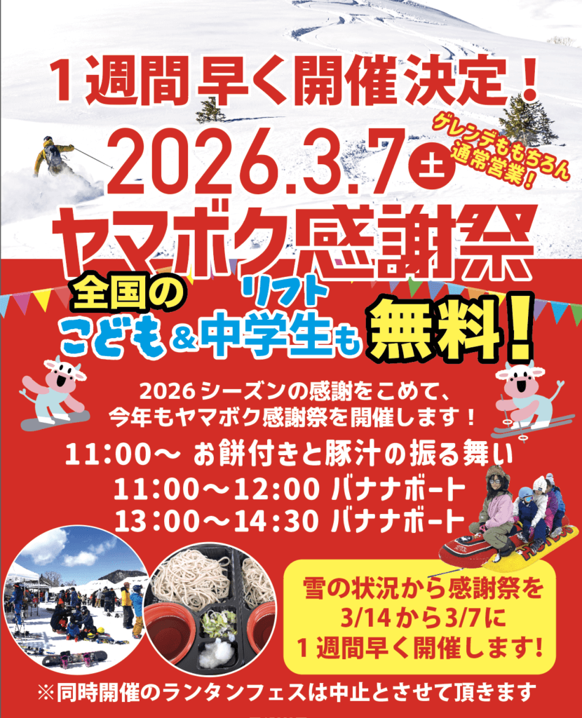 2025/2026年シーズンの感謝をこめて、2026年3月14日(土)に予定していたヤマボク感謝祭を 2026年3月7日(土)に開催します! ご来場の皆様にお子様が楽しめるバナナボートや 手打ちそばや豚汁の振る舞いも味わえます!